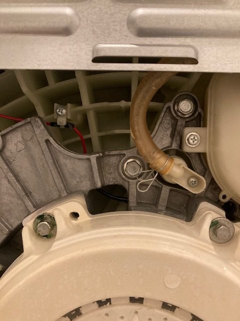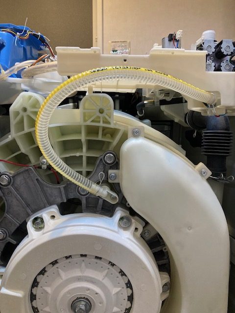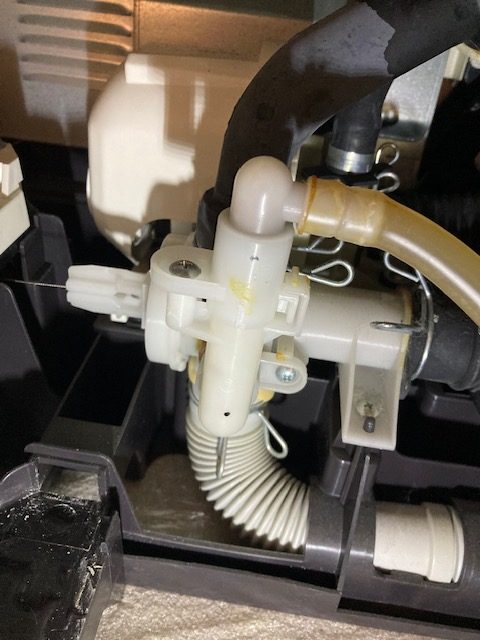 給水部からの経路になります、ホースがかなり鋭角に曲がっている部分の白いジョイントとの付け根部分。ホースに亀裂が入っており、いつ漏水してもおかしくない状況でした。ここも交換しました。