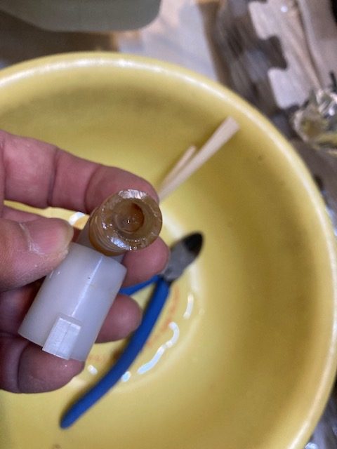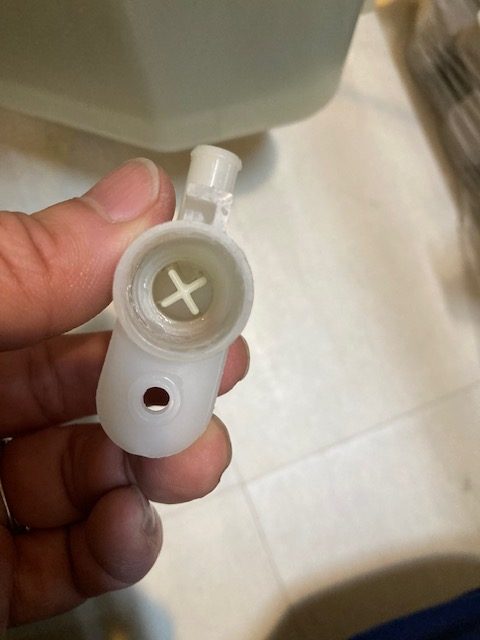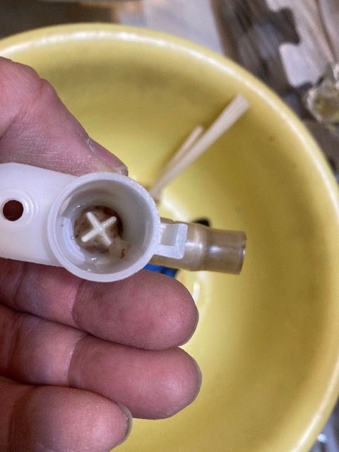ホース側も完全に埋まってます。水を入れても流れないことを確認しました。犯人はこいつです。