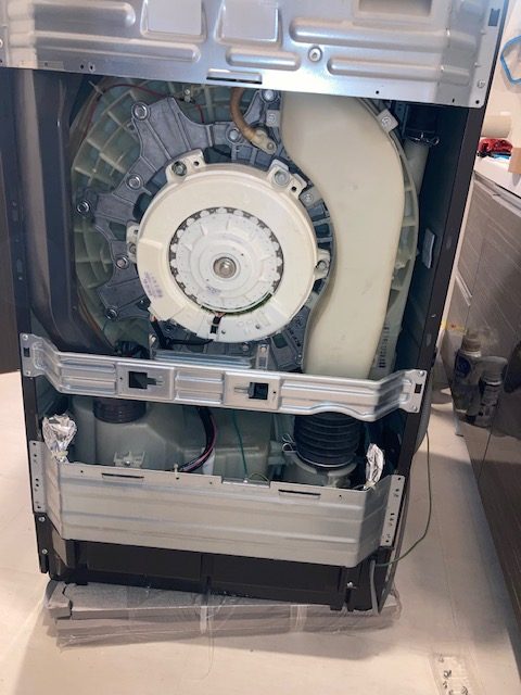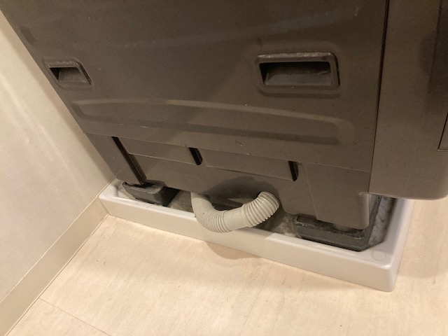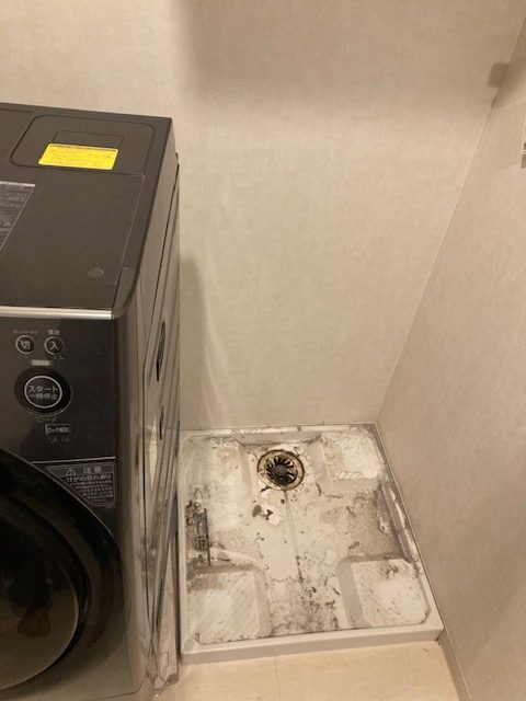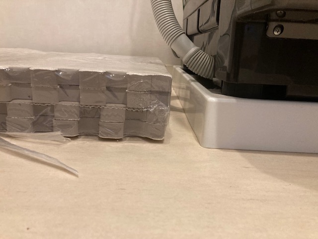 洗濯パンの上に対振動防音用のゴムが設置されています。正直、この80kgの巨体を移動させるのが最大の難関であったと思います。嫁さんと二人でどうにか力技で移動させました。